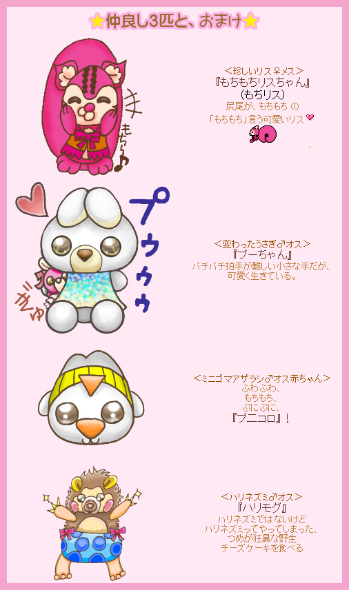 プーちゃん→小人の世界に住んでる、大好きなもちもちとゴマゴマとホワちゃんに会いに来る